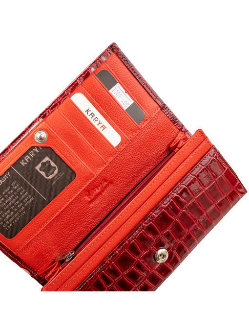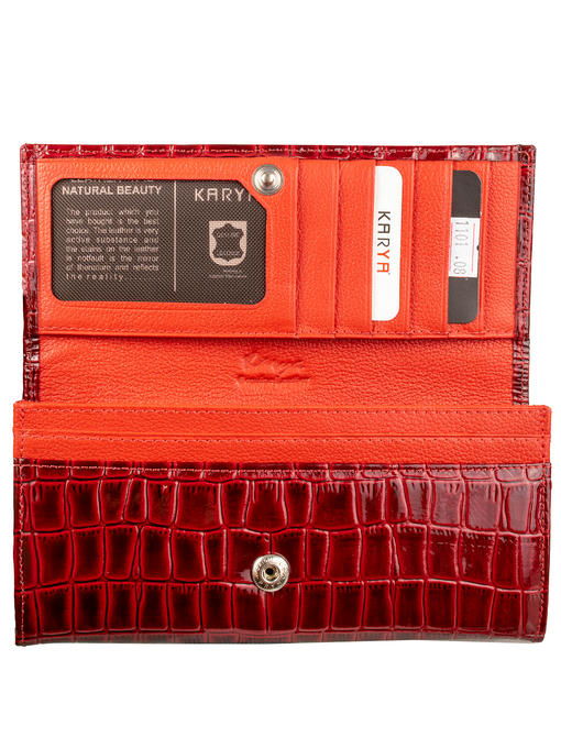 Эффектное взаимодействие ярких красок, стильное тиснение по сияющей поверхности первосортной кожи, игра оттенков – дизайн этого кошелька выполнен на отлично. Такая вещь украсит женский гардероб и всегда будет доставлять эстетическое удовольствие владелице. Тем более, что прослужить брендовое изделие готово долго. Для этого мастера торговой марки KARYA сделали все необходимое. Каждый шов выполнен аккуратно и надёжно фиксирует соединения деталей, края, углы. Форма кошелька-портмоне – большая прямоугольная, с плавным сгибами вверху и снизу и точными линиями по бокам. Устройство функционально, набор отделений и карманов позволяет держать наличность, карточки и прочие предметы в едином, удобно структурированном пространстве
