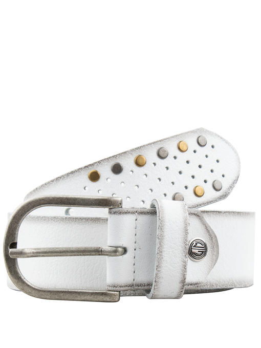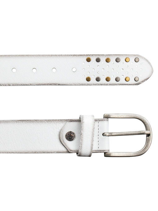 Ремень белого цвета часто служит женщине стильным дополнением костюма. Красиво смотрятся модели из кожи, да и служат они долго, благодаря чему Вы сможете сполна использовать модный потенциал такой вещицы. Аксессуар из коллекции торговой марки LINDENMANN выделяется из однотонных вариантов популярным затемнением по краям (имитирует потёртости, которые подчеркивают высокое качество натурального материала) и дизайном с использованием перфорации и заклёпок. При правильно подобранном размере свободный край изделия будет находиться на видном месте и украсит Ваш образ. Интересной деталью выступает здесь и традиционный винт, закрепляющий пряжку, – он обозначен фирменной эмблемой бренда. Ансамбль в целом выглядит гармонично и радует оригинальностью