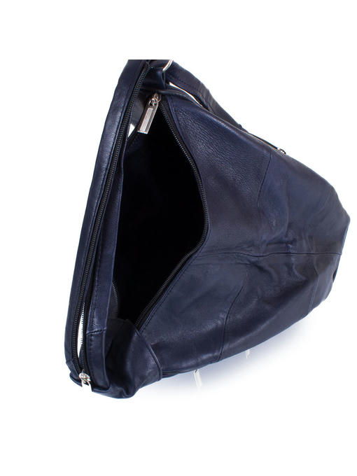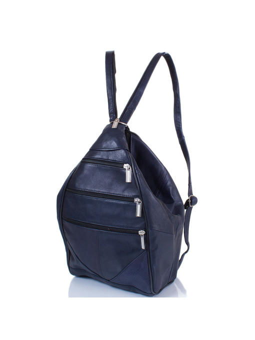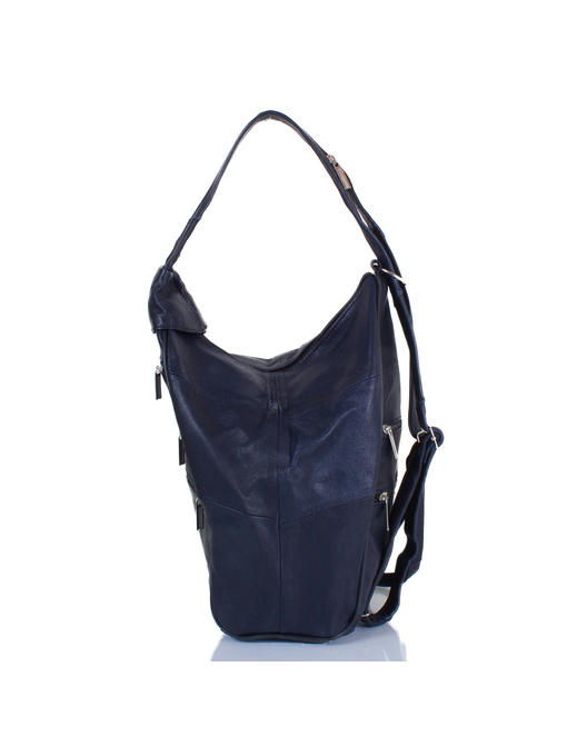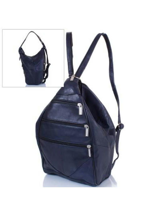 С аксессуаром марки TUNONA Вы получите комфорт в переноске повседневных рабочих или иных вещей и оригинальность для собственного образа. Модель разработана так, чтобы владелица могла спокойно перемещаться в любой обстановке – по городским улицам, на природе, в оживленных местах. Рюкзак-гитара имеет своеобразную форму, расширенную по бокам и снизу, зауженную сверху. Обилие наружных прорезных карманов на «молниях» формирует узнаваемый ансамбль с горизонтальными линиями, оживляет его светло-серебристыми брелоками на бегунках. Важно, что многочисленные отсеки для мелочи имеются и с лица, и на тыльной стороне, а внутреннее отделение очень просторное. Изделие можно носить и как сумку-баул – вариаций достаточно, чтобы чувствовать себя свободно. Темно-синий цвет – неизменно модный, а эластичность и мягкость натуральной кожи просто приятна