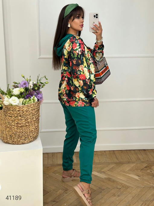 Ориентировочные замеры по готовому изделию: 50 – 52; 54 – 56; 58 – 60 (Кофта: ОГ – 130/138/146 см. ОТ – 128/136/142 см. ОС – 106/114/122 см. Длина рукава – 54 см. Длина изделия – 70 см. Брюки: Обхват талии – 76 см. Обхват талии натянутая резинка – 104/112/120 см. ОС – 114/122/130 см. Обхват Штаныны вверху – 66 см. Обхват Штаныны икра – 50 см. Длина изделия