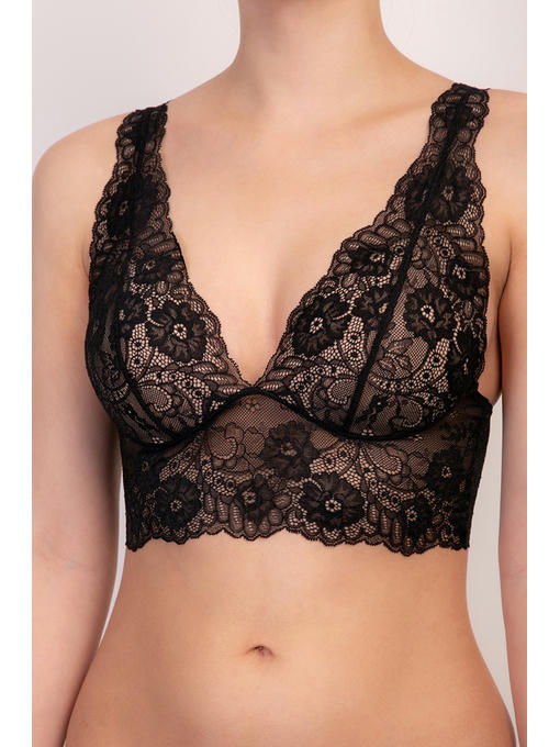 Кружевной топ на широких удобных бретелях с тонкими вставками из поролона. Бюстгальтер из прозрачного кружева с v-образным вырезом, без металлических застежек. Особенно удобен в жаркое время года.