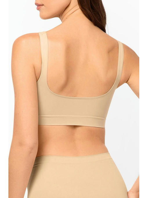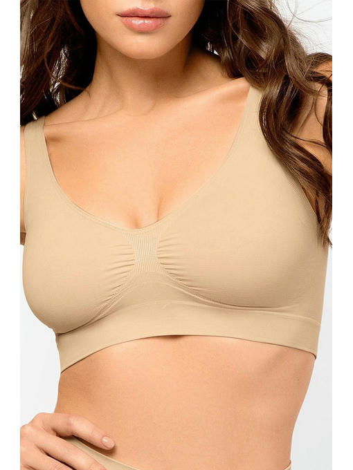 Женский бесшовный бюстгальтер-полутоп выполнен из микрофибры в базовом бежевом цвете. Бесшовный топ-бра женский не имеет косточек. Эффект Push-Up достигается благодаря более плотному переплетению нитей по центру лифа. Удобные эластичные лямки и широкая резинка снизу дарят нежную и надежную посадку.