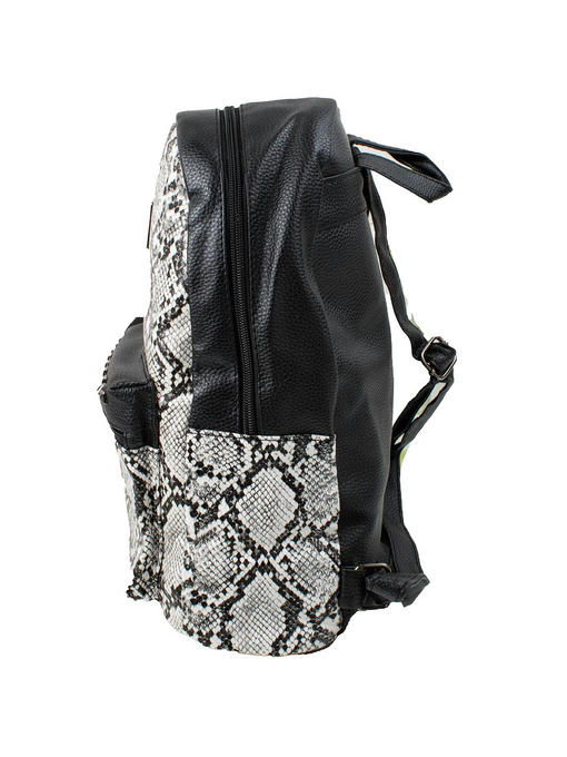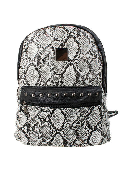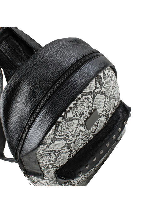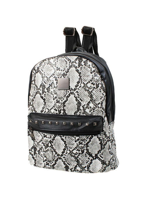 Контрастный чёрно-белый ансамбль приобретает особое звучание в оформлении этого женского рюкзака. Светлые детали с рисунком под окраску змеи добавляют в образ модные нотки, женственность и всегда желанную оригинальность. Аксессуар торговой марки VALIRIA FASHION оснащён фурнитурой под чернёное серебро, которая гармонично вписана в общую расцветку, и декор лицевой стороны выполнен металлическими элементами такого же характера. Накладной карман с лица на молнии делают простую плоскую форму более выразительной. Рюкзачок изготовлен из заменителя кожи, внутри у него качественная тканевая подкладка. Все швы тщательно прошиты, припуски внутри окантованы, снаружи линии молний усилены отделочными строчками. Устойчивое дно, скруглённый верх, ровная спинка – модель удобна для повседневного ношения..