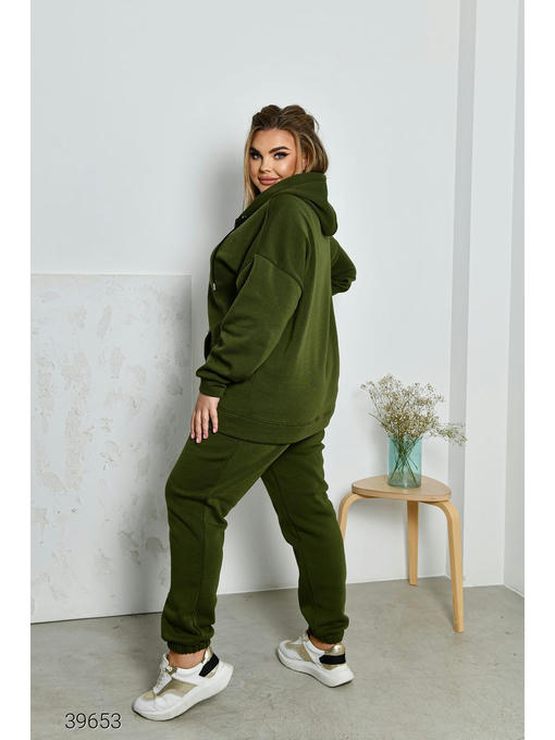 Женский теплый костюм. Кофта с капюшоном, в кулиску которого продет шнурок. Линия плеча спущена, накладные карманы «кенгуру». Штаны с посадкой выше средней. По талии на резинке. В боковых швах карманы. Низ Штанын на резинке. Ткань: трикотаж трёхнить с начёсом.