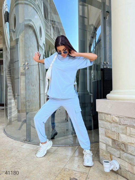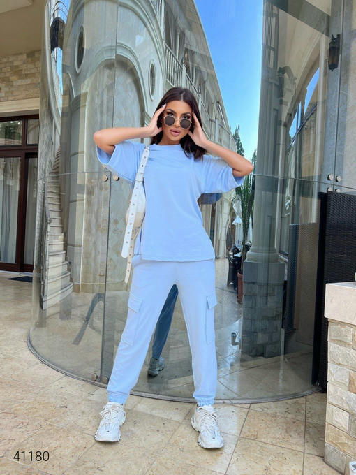 Женский трикотажный костюм. Футболка и джогеры. На штанах пояс и манжеты на резинке, по бокам карманы.