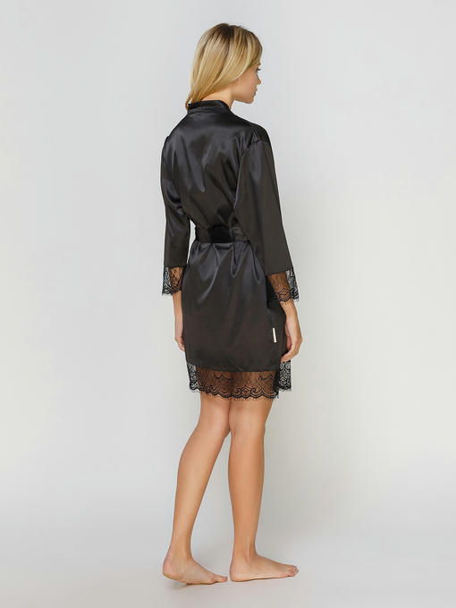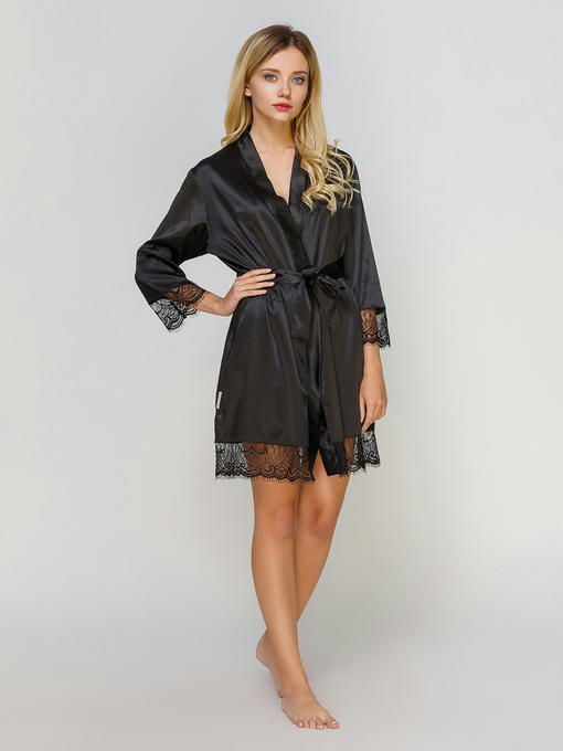 Женский халат (пеньюар) ткань сатин шелк, цвет черный с черным кружевом, длина чуть выше колена, рукав /, под пояс
