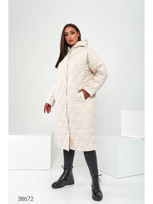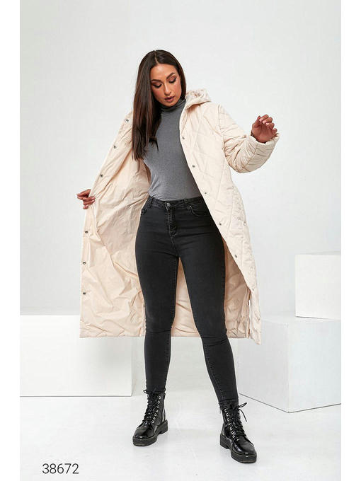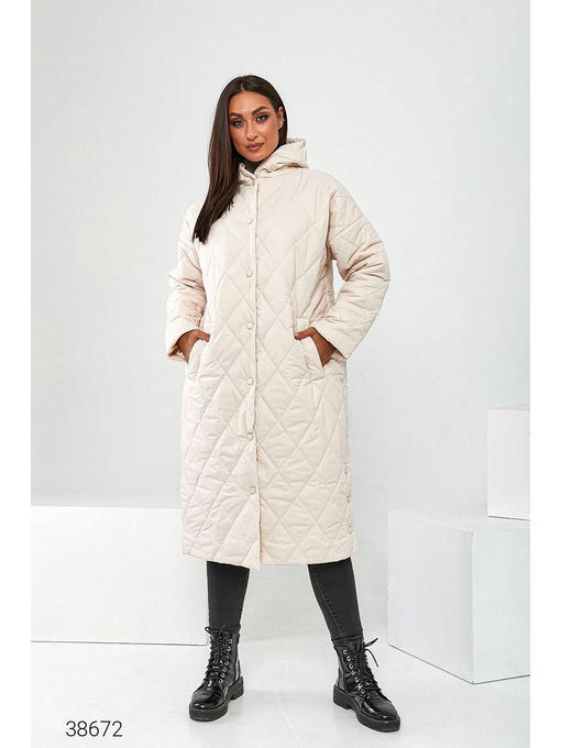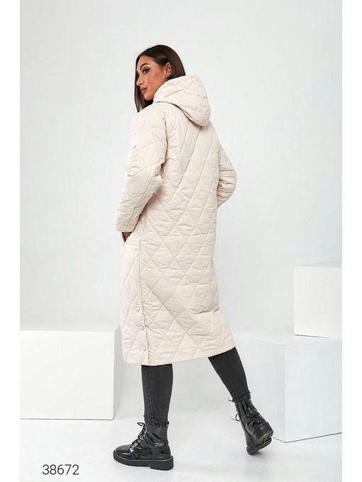 Женское стеганое пальто с капюшоном. Ткань – плащевка стеганая на силиконе 150 г/м2. Застегивается на кнопки, есть карманы. Для вашего комфорта снизу разрезы, которые можно застегнуть на кнопки.