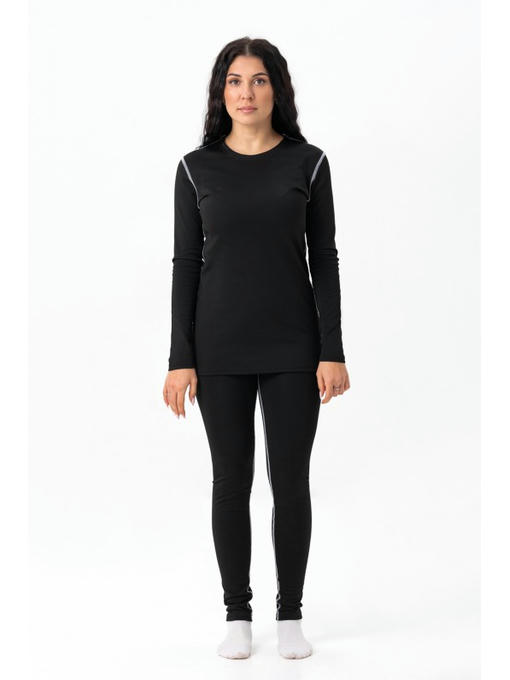 На кофте прямого кроя круглый вырез. Благодаря такому вырезу термобелье не выступает из-под одежды, его можно носить каждый день. Мягкая линия рукава, которая подстраивается под ширину плеч. Штаны-лосины со средней посадкой. Пояс на эластичной резинке. Кофта и лосины имеют более акцентные швы в качестве декора.