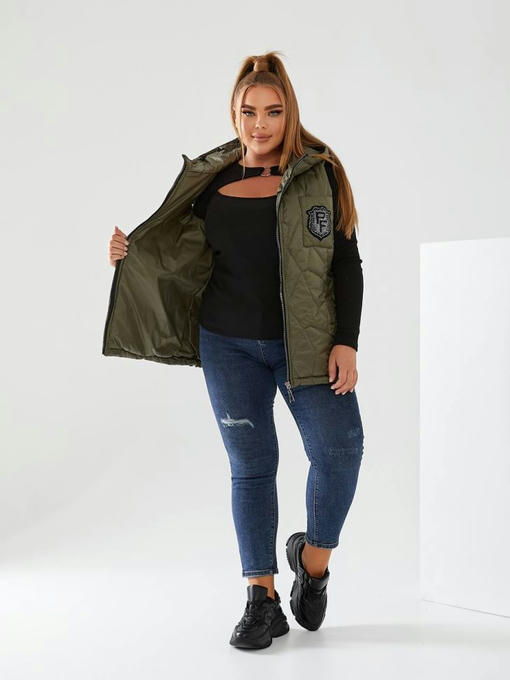 Стильный стеганный жилет с карманами, удобный глубокий капюшон, декорированная нашивкой с камнями, качественная фурнитура. Ткань: плащевка Лаке + синтепон 150