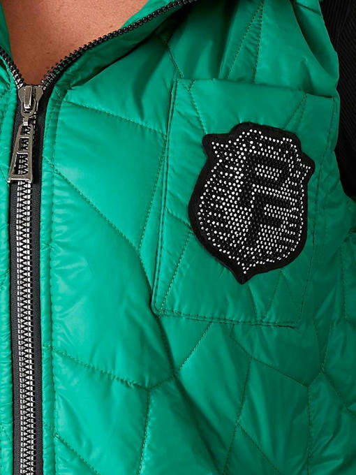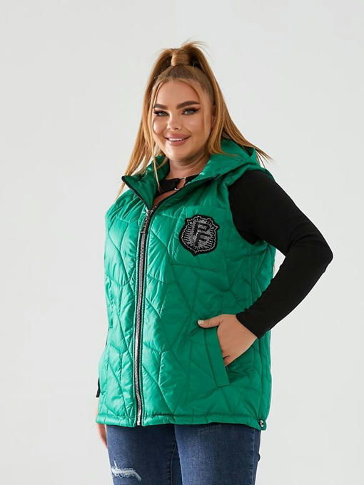 Стильный стеганный жилет с карманами, удобный глубокий капюшон, декорированная нашивкой с камнями, качественная фурнитура. Ткань: плащевка Лаке + синтепон 150
