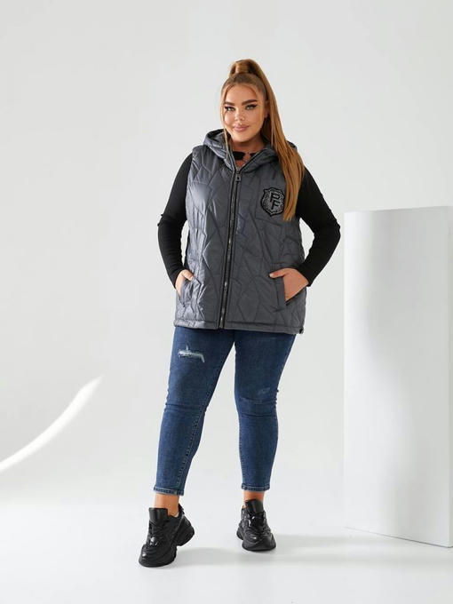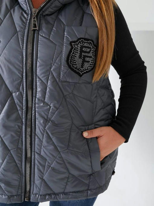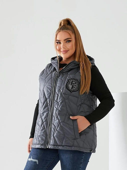 Стильный стеганный жилет с карманами, удобный глубокий капюшон, декорированная нашивкой с камнями, качественная фурнитура. Ткань: плащевка Лаке + синтепон 150