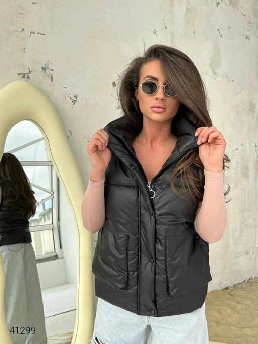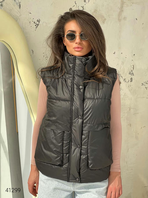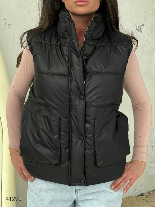 Жилет женский с накладными карманами. Ткань: плащовка Лаке, наполнитель силикон 150. Кнопки в цвет жилетки.