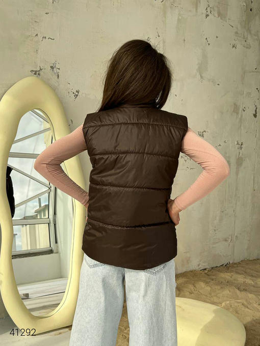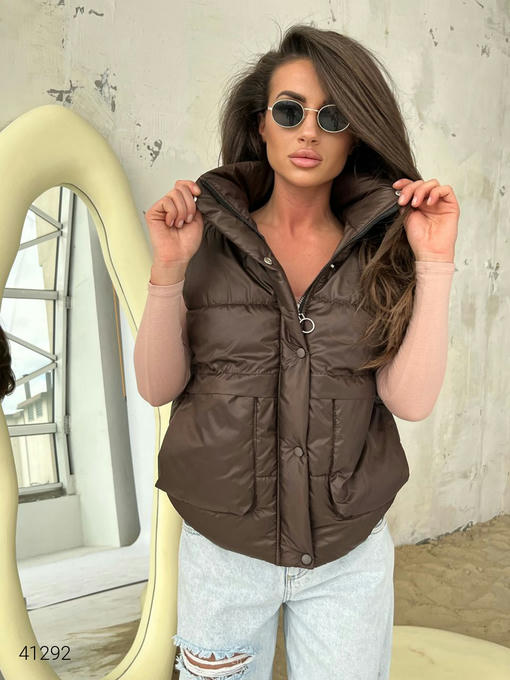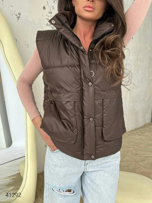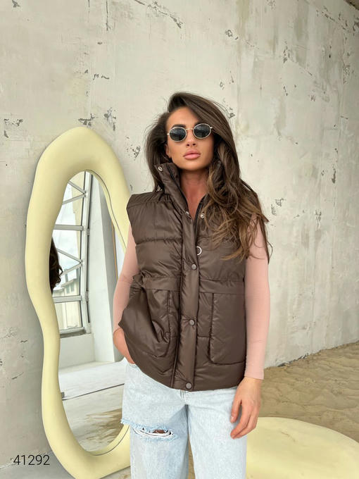 Жилет женский с накладными карманами. Ткань: плащовка Лаке, наполнитель силикон 150. Кнопки в цвет жилетки.