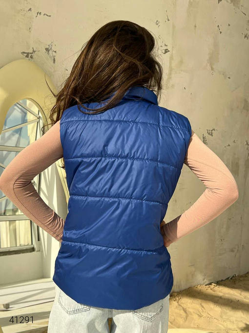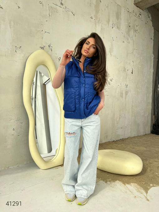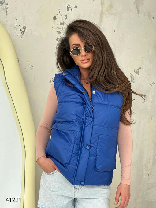 Жилет женский с накладными карманами. Ткань: плащовка Лаке, наполнитель силикон 150. Кнопки в цвет жилетки.
