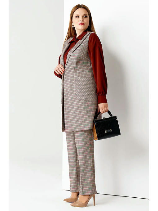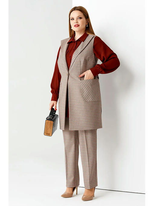 Практичный жилет женский поможет вам разнообразить повседневные офисные аутфиты. Его можно носить с юбкой, классическими брюками, комбинировать с блузками, водолазками, свитерами. Жилет женский трикотажный позволит вам каждый день выглядеть эффектно и модно. Женский жилет большого размера создан из мягкого, приятного на ощупь костюмного трикотажа в трендовую мелкую клетку. Имеет подкладку. Модель с глубоким V-образным вырезом, дополненным отложными лацканами, застегивается на одну пуговицу. Жилет удлиненный женский приталенного кроя скрывает область живота и бедер. Высокие разрезы в боковых швах и большие округлые накладные карманы придают изделию оригинальность. Жилет трикотажный женский не стесняет движений, обеспечивает удобство и комфорт. Вещь не сминается, не теряет форму, устойчива к активной носке и частым стиркам. Вы можете купить жилет женский утепленный удлиненный, чтобы в холодное время года он дарил вам тепло и красоту