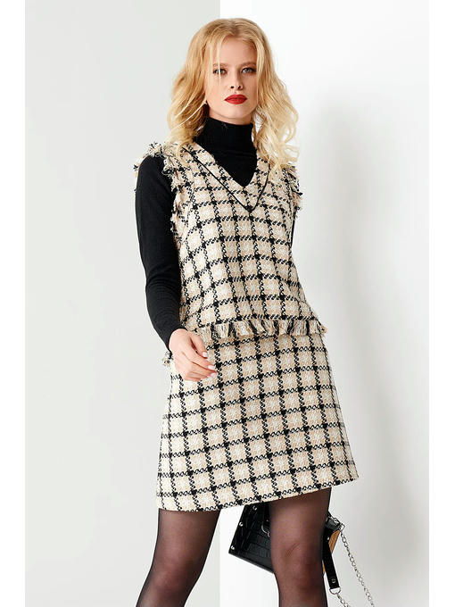Находка для осеннего и зимнего образа — жилет в клетку женский, гармонично сочетающийся с однотонными джемперами, гольфами и тонкими свитерами. Жилет женский Panda можно носить с юбками, брюками и джинсами. Он разбавит скучный повседневный образ, согреет и создаст модный аутфит. Жилетка изготовлена из натурального хлопка с добавлением вискозы и полиэстера. Фактурная вафельная ткань украшена классическим принтом. Жилет женский трикотажный с V-образным вырезом, подчеркнутым черной строчкой. Проймы рукавов и низ украшен бахромой, изготовленной из основной ткани. Жилетка женская выполнена в прямом укороченном фасоне. Она защитит ваше тело от холода и позволит носить под низом облегающие и полуприталенные вещи. Жилет укороченный женский визуально делает фигуру пропорциональной. Жилет в клетку сочетает в себе нежные оттенки молочного цвета. Стильная безрукавка освежит повседневные сеты и офисный гардероб. Вы можете заказать женский жилет 42-46 размера по доступной цене