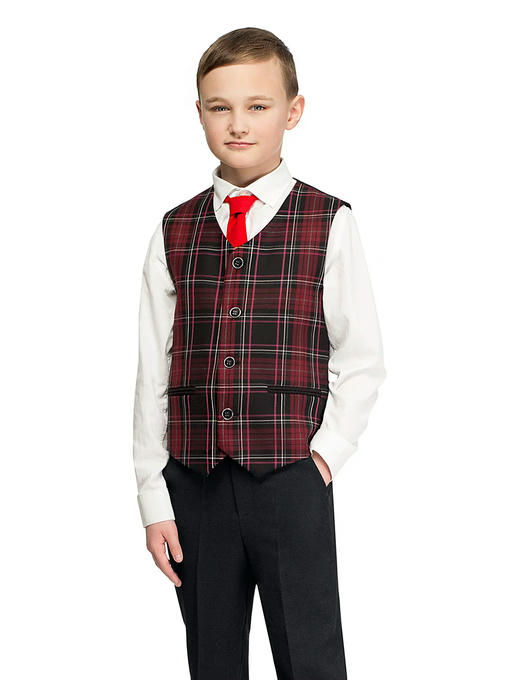 Жилет для мальчика полуприлегающего силуэта с центральной застежкой на четыре петли и пуговицы, с V -образным вырезом горловины. Перед жилета цельный. На боковых частях переда расположены боковые прорезные карманы в рамку. Спинка со средним швом и с рельефными швами, идущими от проймы до низа изделия. По спинке регулятор. Жилет на подкладке