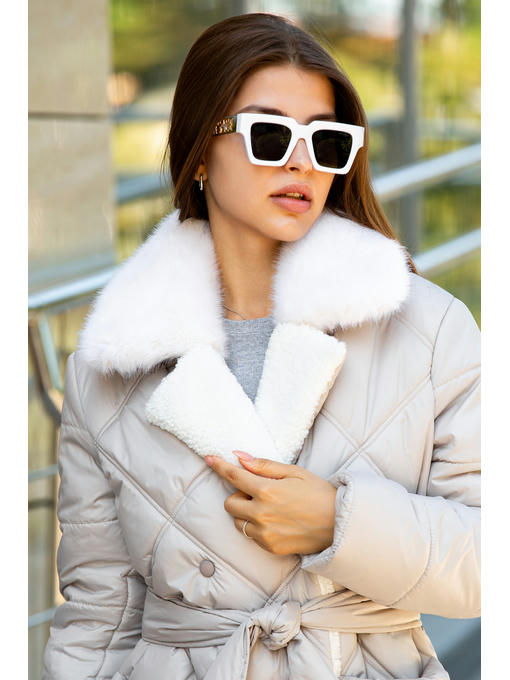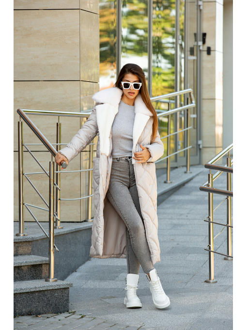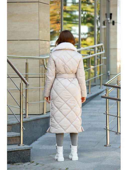 Зимнее стеганое пальто с водоотталкивающей плащевки и эко меха норки на воротнике.