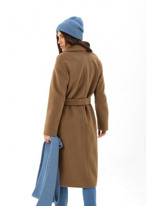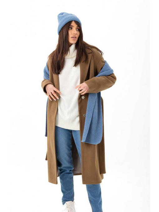 Классическое пальто длиной ниже колена. Застёгивается кнопками. За счет отсутствия внешней фурнитуры пальто выглядит немного строго и утонченно. Последний аккорд образу добавит пояс.