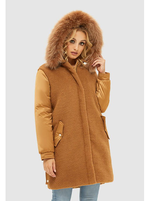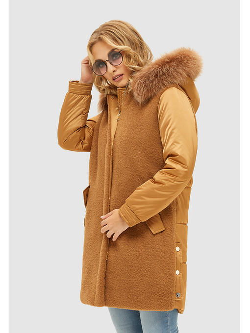Зимний комбинированный пуховик с опушкой из натурального меха енота с искусственным мехом по переду изделия.