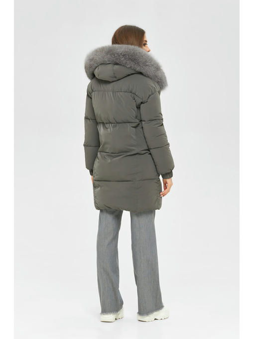 Удлиненный пуховик из бархатной плащевой ткани с натуральным мехом песца.