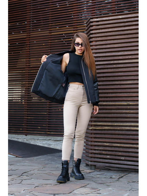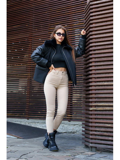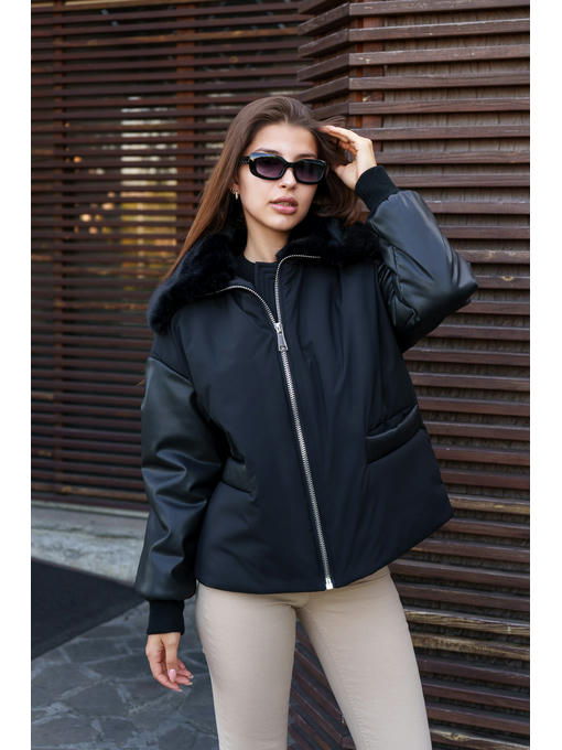 Зимняя комбинированная куртка с водоотталкивающей плащевки, рукавами из эко кожи и воротником из эко меха норки.