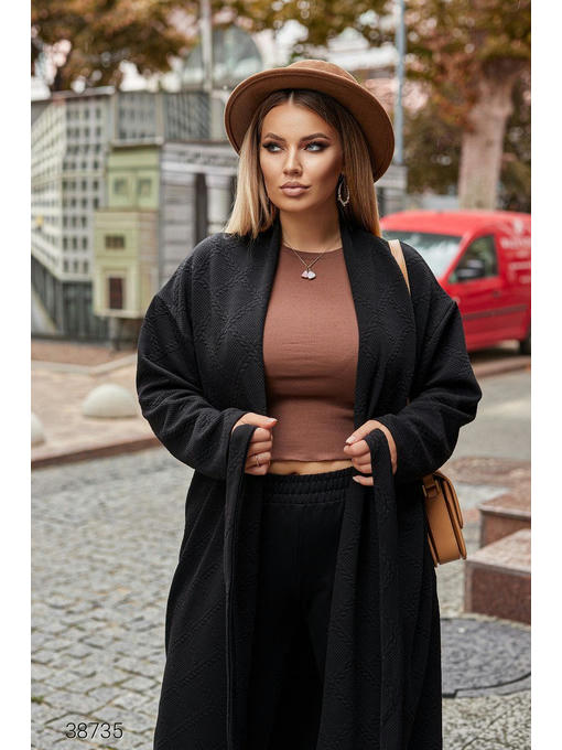 Кардиган женский больших размеров. Ткань – плотный фактурный трикотаж. Застежек нет, завязывается поясом.