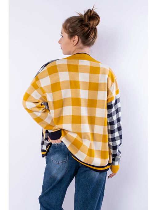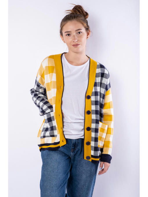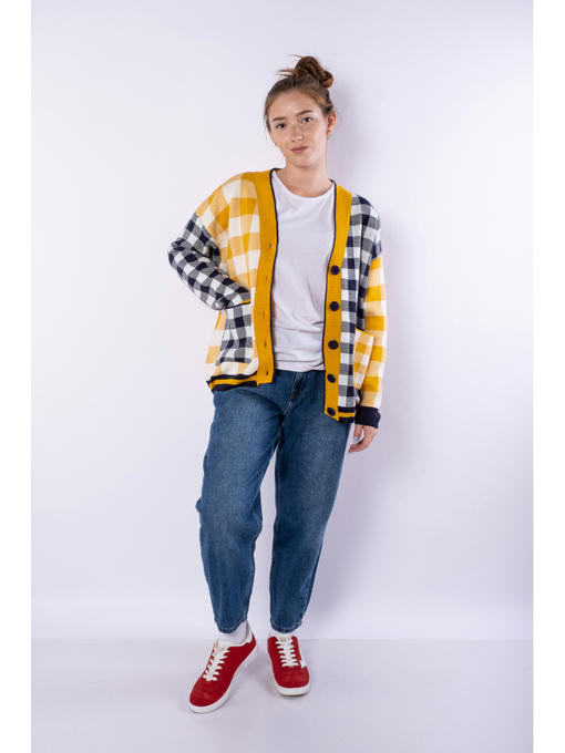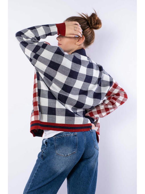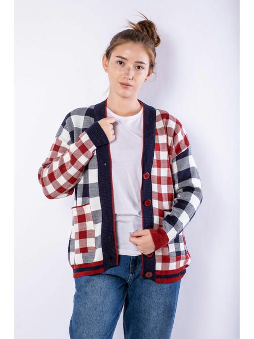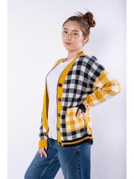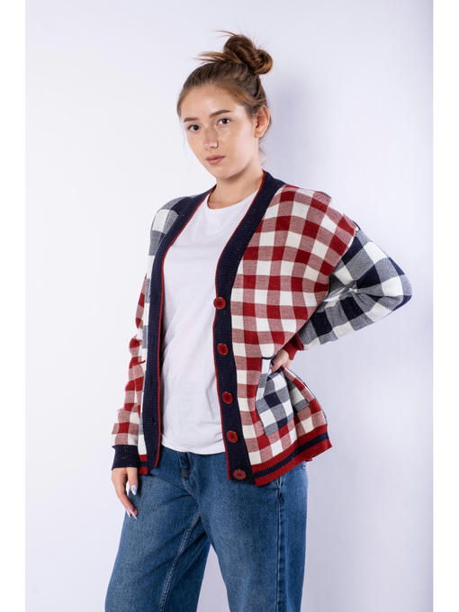 Яркий и стильный женский кардиган с комбинированным клетчатым рисунком, выполнен из акриловой пряжи с легкими вкраплениями серебристого люрекса. Благодаря такому составу, изделие в меньшей степени склонно к растягиванию и усадке, а также продолжительное время сохранит привлекательный внешний вид.