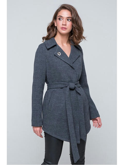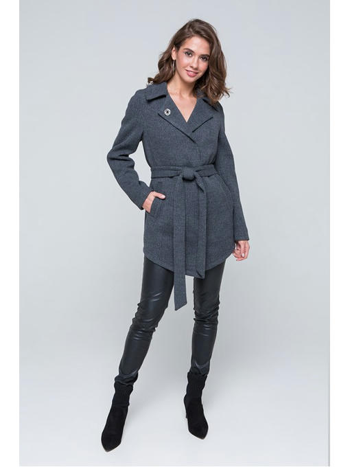 Рукава-реглан, карманы – прорезные с листочкой. На отложном воротнике с лацканом – брошка. Трикотажный кардиган закрывается металлическими кнопками. В комплекте к изделию идет длинный пояс.