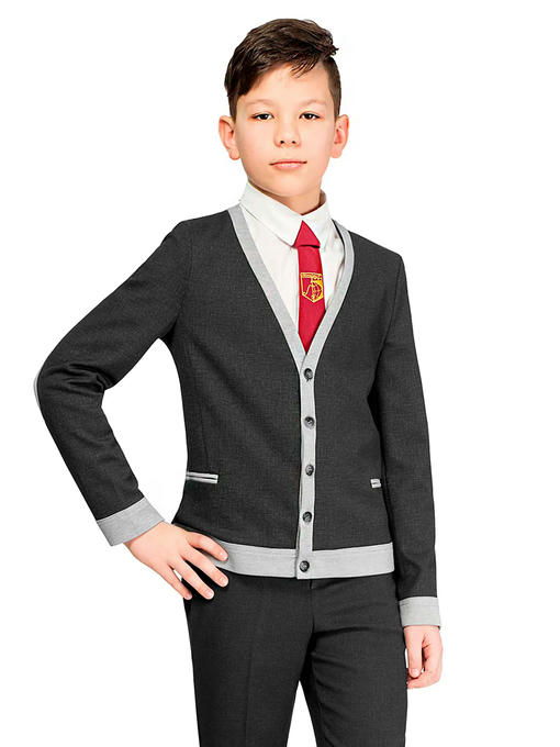 Строгий кардиган для мальчика среднего школьного возраста из трикотажного полотна. Кардиган полуприлегающего силуэта с рельефами по переду и по спинке, со сквозной застежкой на петли и пуговицы.По низу кардигана и по низу рукавов притачная манжета. Рукава длинные двухшовные. На локтях настрочные налокотники. По переду прорезные карманы в рамку