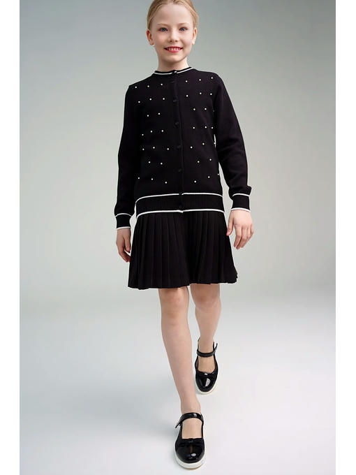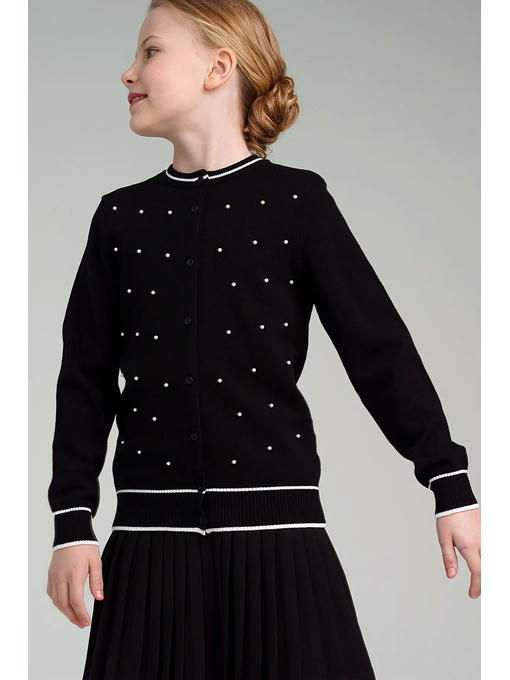 Кардиган из вязаного трикотажа. Прямой силуэт. Застежка на пуговицы. Декорирован жемчужными бусинами