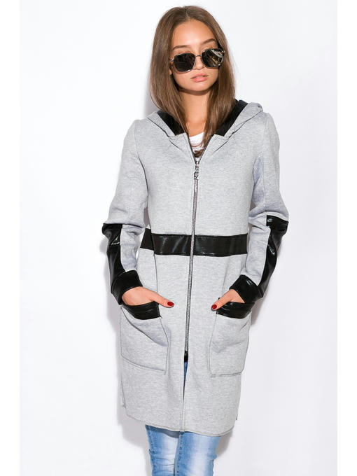 Оригинальный по дизайну, кардиган с капюшоном, выполнен из хлопкового трикотажа на флисе и дополнен контрастной, глянцевой отделкой. Центральная застёжка, осуществляется на пластиковую молнию с имитацией металла. Дополнительное удобство и комфорт, обеспечиваются благодаря наличию объемных накладных карманов и трикотажной подкладке капюшона.
