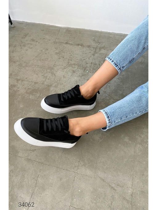 Кеды из натуральных комбинированных материалов – гладкой кожи и замши. Высокая легкая платформа из пеноматериала, на шнуровке. Уплотненный манжет, есть вспомогательная петля для легкого надевания.