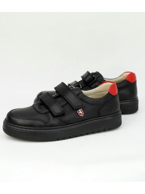 Кеды Polipeys в черном универсальном цвете с красными элементами. Модель высочайшего качества, выполненная полностью из натуральной кожи, как снаружи, так и внутри, стелька также кожаная. Кеды легкие и удобные на липучках создадут комфорт для вашего ребенка.