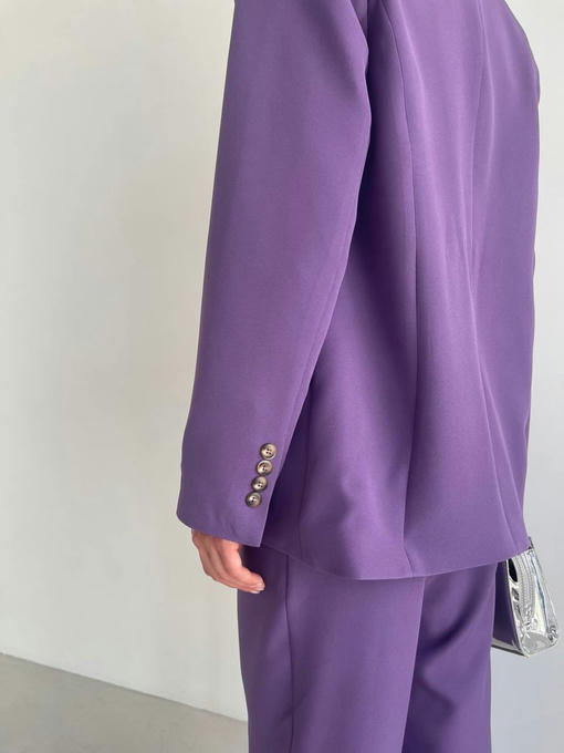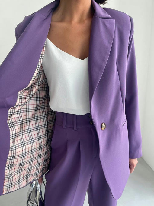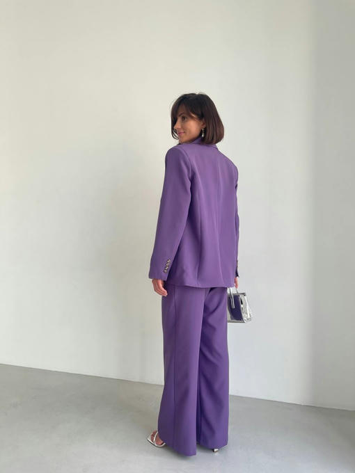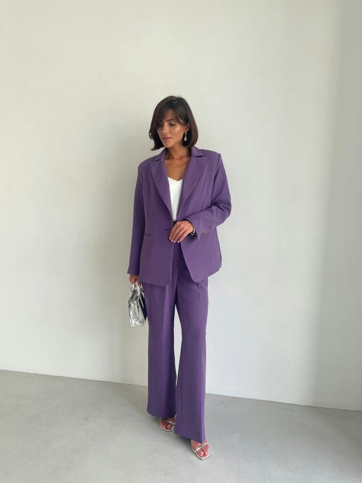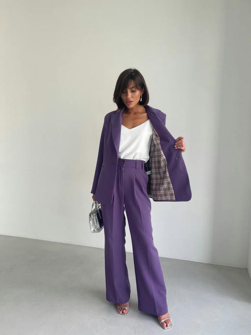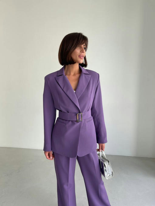 Костюм выполнен в офисном стиле. Жакет полу-приталенного силуэта. Брюки прямого силуэта классического кроя с заутюженной стрелкой и двумя складами. Жакет длиной до бедра. Длина брюк предусмотрена для носки под каблук. Под обувь на низком каблуке брюки можно элегантно подвернуть, образовав манжет. Жакет на однобортной застежке на петлю и пуговицу. Брюки с застежкой гульфик на молнии, пояс по краям фиксируется на петли и пуговицы. Английский воротник придает элегантности строгому жакету. Двух шовный рукав, по низу локтевого шва заканчивается шлицей-обманкой и декорирован пуговицами. Карман прорезной в рамку удачно дополняет модель жакета, элегантно и функционально. На брюках карманы удобно расположены в подрезном бочке. На жакете съёмный пояс на пряжке. Костюм прекрасно сочетает в себе удобство и элегантность. Не смотря на строгость делового костюма, его можно носить как под туфли на высоком каблуке, собираясь на деловую встречу, так и под кеды на прогулке в городском парке. Дополнив образ туфлями на высоком каблуке, можно посетить торжественное мероприятие или отправиться на романтическое свидание.