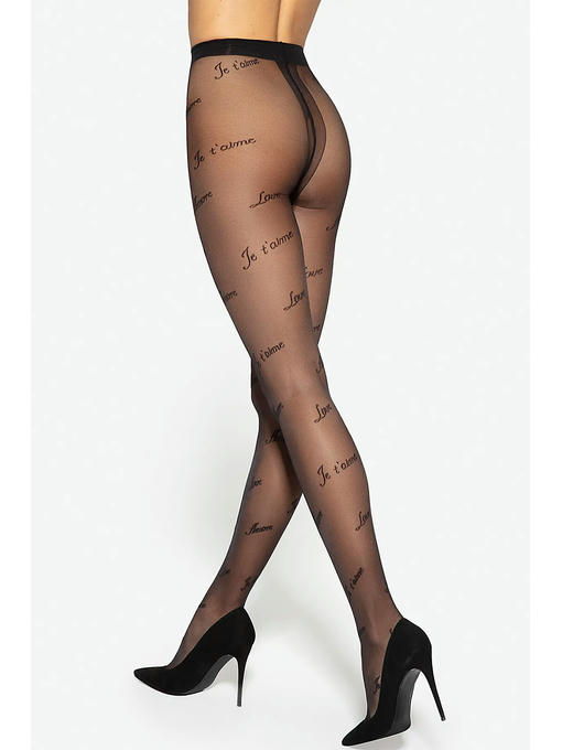 Тонкие фантазийные колготки с лайкрой, плотностью 20 ден, с широким комфортным поясом, гигиеничной ластовицей и усиленными плоскими швами. Вся нога модели декорирована надписями на тему любви