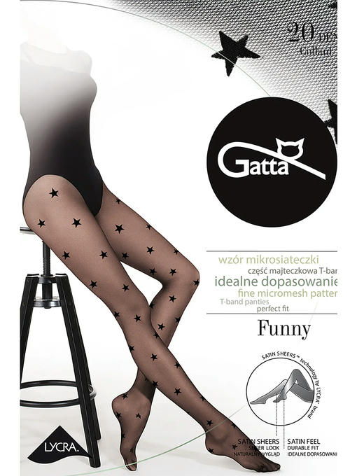 Тонкие фантазийные колготки в мелкую тюлевую сетку, с лайкрой, плотностью 20 ден, с широким комфортным поясом, ластовицей и усиленными плоскими швами. По всей ноге модели тканый узор “звездочки”