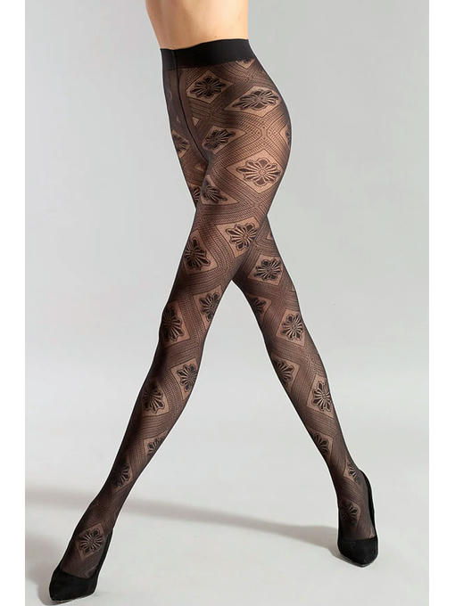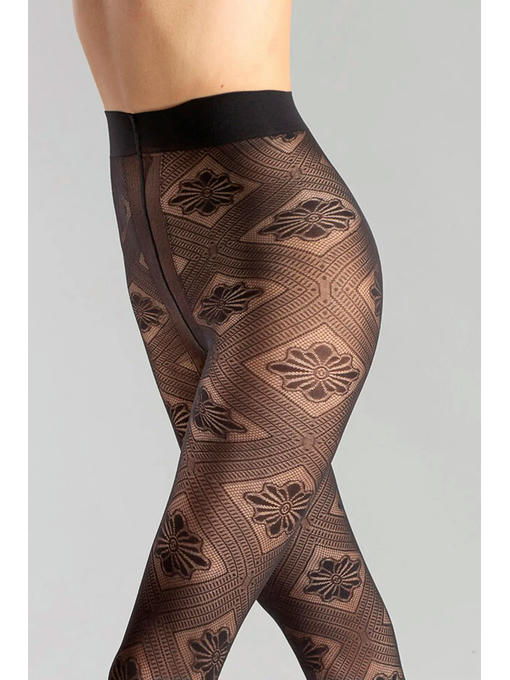 Полупрозрачные фантазийные колготки плотностью 40 ден с более тонкими вставками 20 ден. У модели широкий комфортный пояс, гигиеничная ластовица и усиленные плоские швы. По всей ноге колготок размещен геометрический узор в сочетании с цветочным