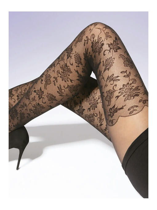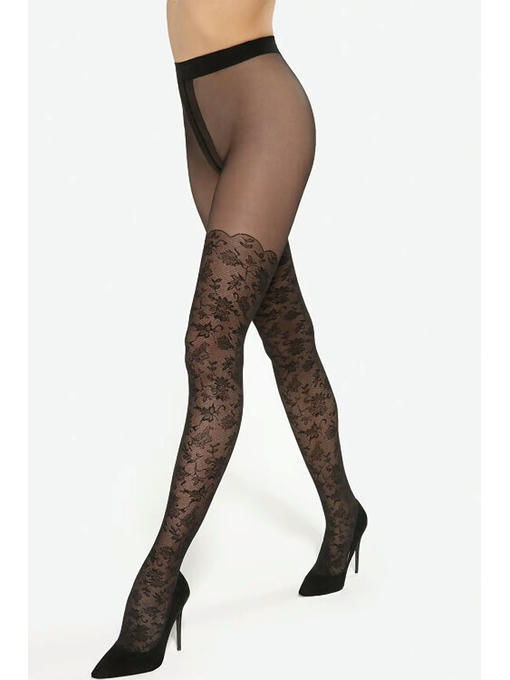 Тонкие (20 ден) фантазийные колготки с широким комфортным поясом, ластовицей и усиленным плоским швом. Снизу имитация более плотных (40 ден) гольфин с эффектом тюля и цветочным узором