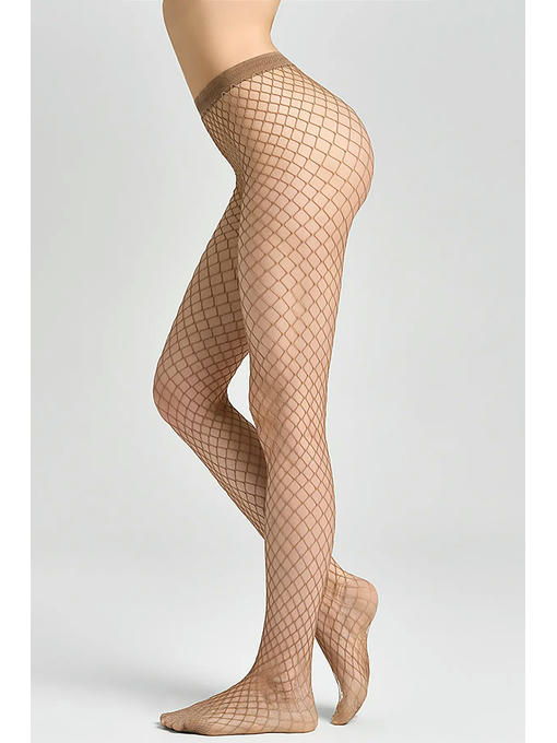Классические бесшовные колготки в крупную сетку, с укрепленным мыском и широким ажурным поясом. Превосходно облегают и комфортно ощущаются на теле, а усиленный мысок надежно фиксирует пальчики