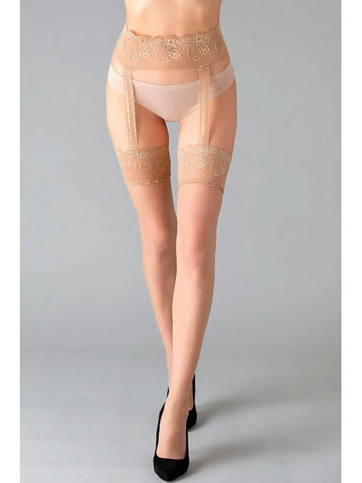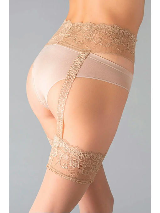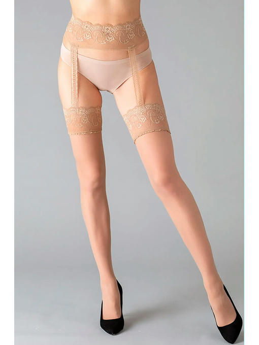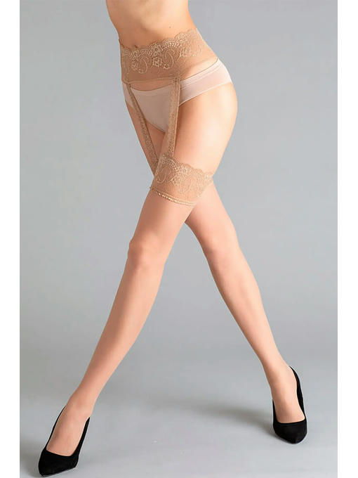 Тонкие шелковистые колготки плотностью 20 ден, с элегантным кружевным поясом и открытыми бедрами. Верхняя часть модели имитирует соблазнительные чулки “под пояс” с кружевной каймой на силиконе