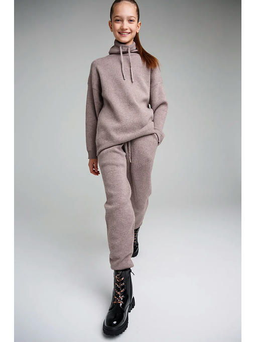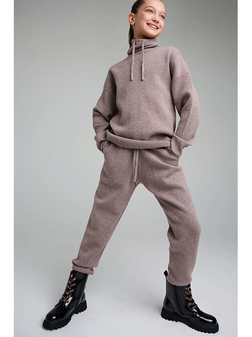 Комплект: джемпер и брюки из вязаного трикотажа. 50% вискоза. Вискоза отличается высокой гигроскопичностью – она впитывает влагу и отлично сохраняет тепло. Горловина, манжеты и низ изделия в рубчик. Брюки с эластичным поясом на шнурке. Карманы в боковых швах