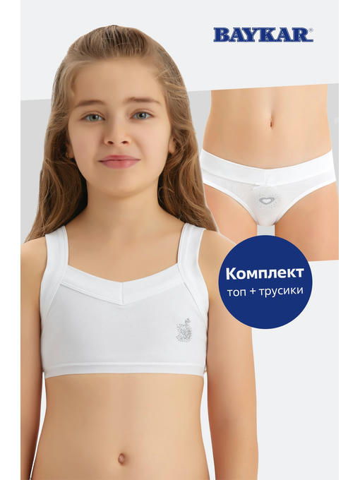 В наборе базовые трусики и топ. Классический топик на широких лямках не ощущается на теле и незаметен под одеждой. Его прямой силуэт не стесняет движений, все швы гладкие и ровные, не натирают нежную кожу. Эластичная резинка в поясе трусиков комфортно прилегает к телу и не сдавливает кожу ребенка. Удобная ластовица и анатомические швы гарантируют идеальную посадку.