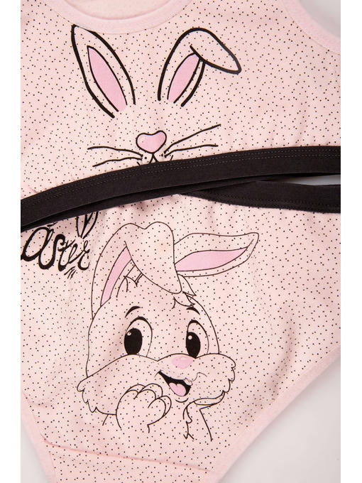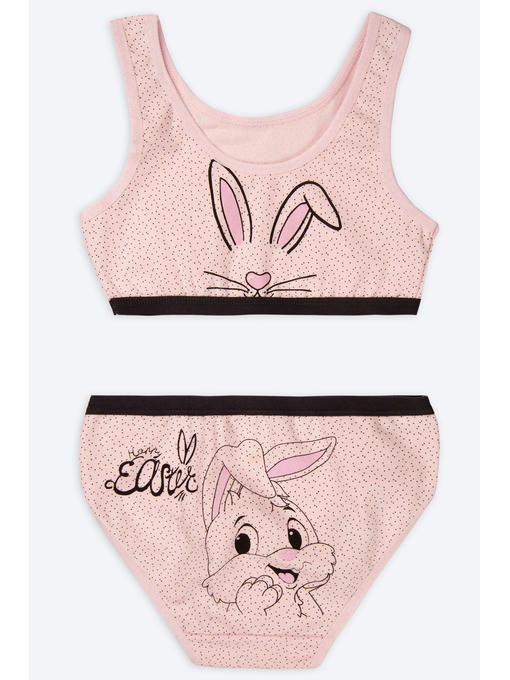 Комплект белья для девочки и девочки подростка выполнен из натурального хлопка с эластаном. Бельевой комплект розового цвета комфортно носить под любую одежду круглый год. В наборе майка топ для девочек и трусы с принтом Кролик и рисунком в горошек.
