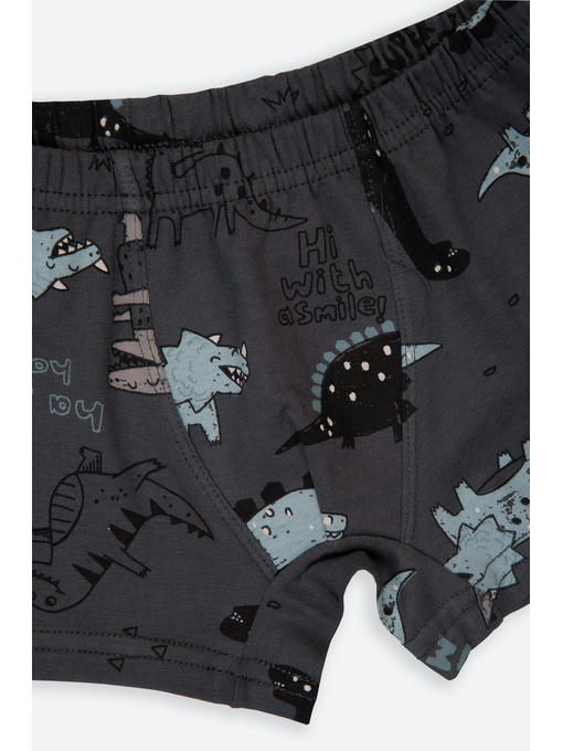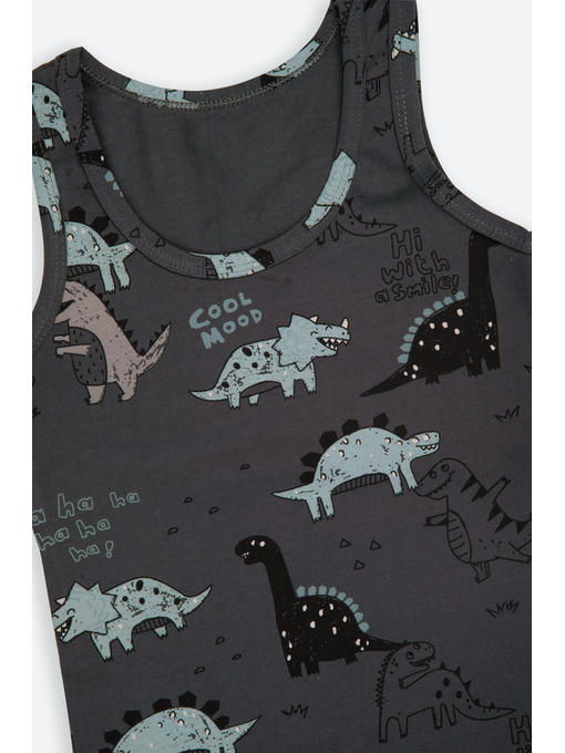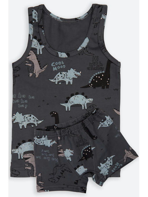 Детский бельевой комплект графитового цвета для мальчика выполнен из натурального гипоаллергенного хлопка. Милый рисунок с динозаврами порадует маленького исследователя.