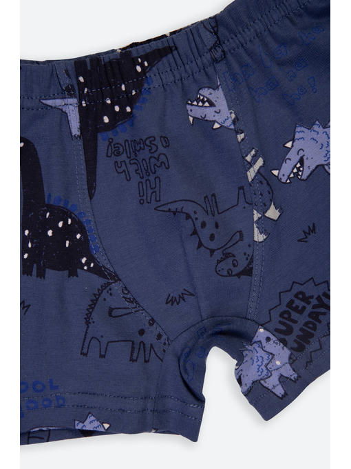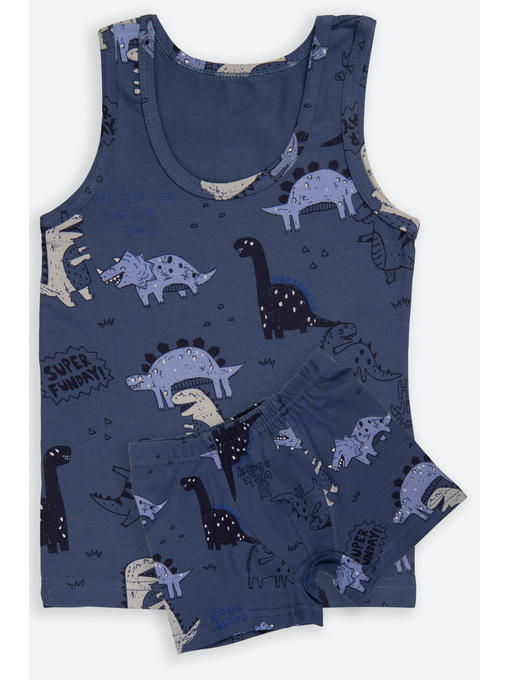 Детский бельевой комплект темно-синего цвета для мальчика выполнен из натурального гипоаллергенного хлопка. Милый рисунок с динозаврами порадует маленького исследователя.