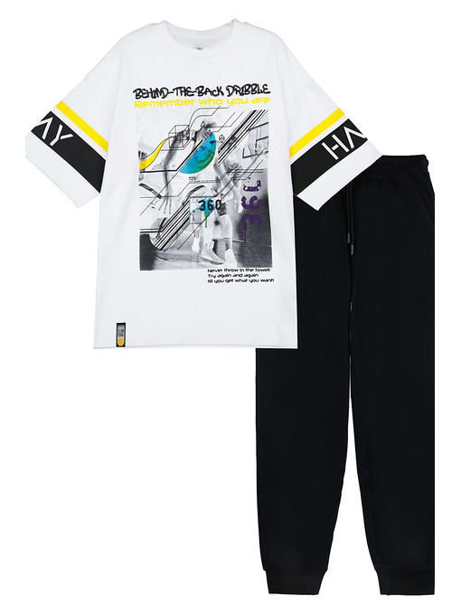 Комплект: футболка и брюки. Выполнен из эластичного и приятного на ощупь трикотажа. Посадка comfort fit – свободный крой. Брюки с карманами в боковых швах. Эластичный пояс со шнурком. Эластичные манжеты по низу брючин. Высокое содержание хлопка 95%. Благодаря наличию эластана в составе ткани изделие держит форму и меньше мнется
