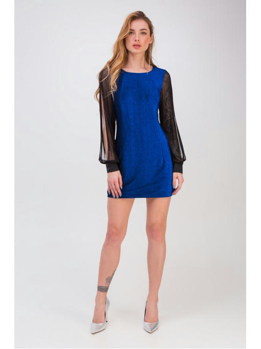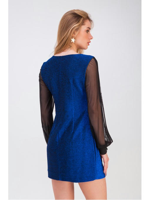 Короткое коктейльное платье сделает любой выход в свет – событием номер один. Основа платья – ткань с эффектом люрекса. Прямой фасон, вырез-лодочка. Рукава сшиты из стильного материала-сетки. На рукавах с разрезами есть манжеты с небольшими пуговицами. Платье шикарно смотрится как под колготки, так и на голые ножки.