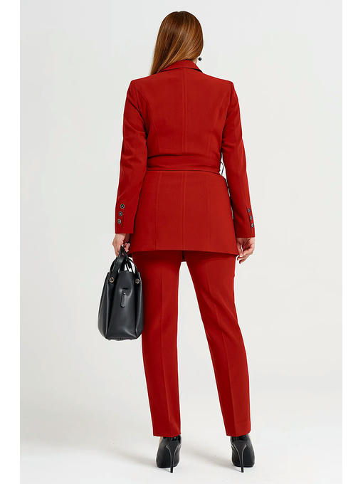 Костюм женский 2-ух предметный Брюки прямые, по переду заутюженная стрелка Жакет удлиненный, по переду расположены карманы с клапаном По переду и спинке выполнены рельефы для мделирования фигуры Рукав втачной длинный, по низу рукава шлица В комплекте идет пояс