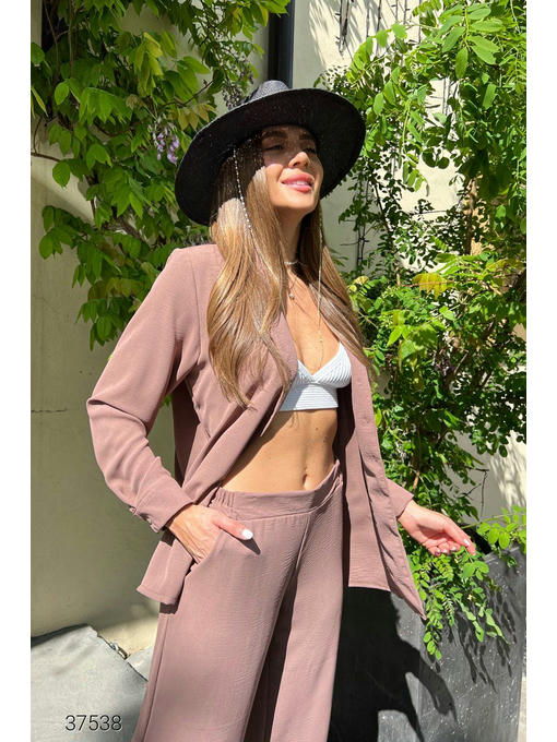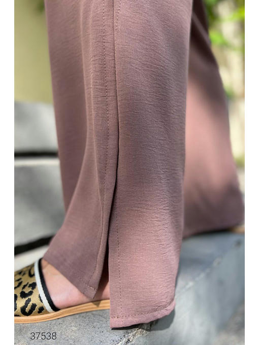 Костюм из рубашки и брюк. Рубашка застегивается на пуговицы. Брюки на резинке с разрезами снизу.